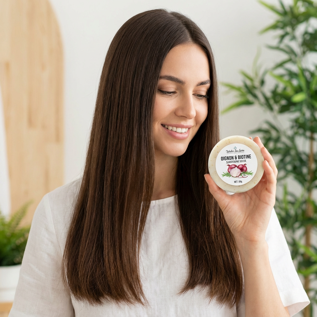 Notre shampooing solide concentré transforme cheveux ternes en crinière éclatante. Oignon fortifie, biotine répare, romarin sublime.